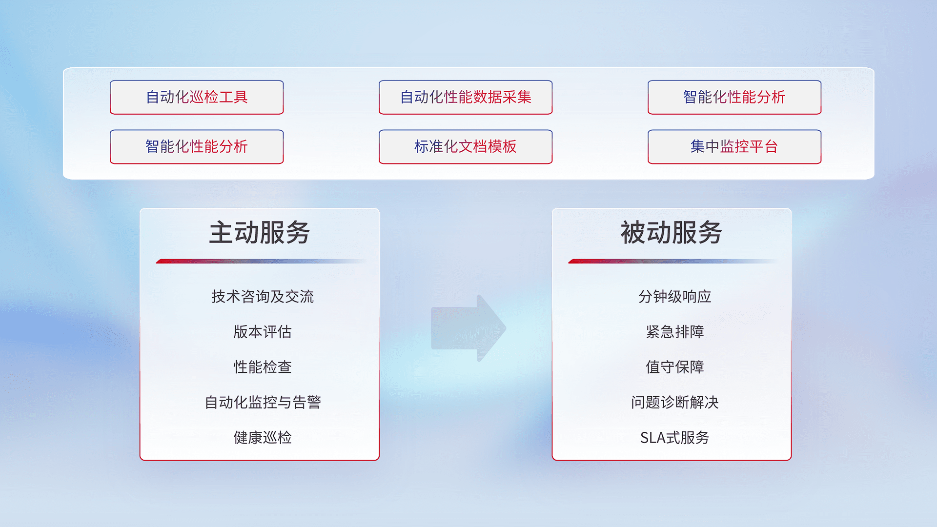 智能化工具和标准化文档,,保障服务质量,,,,提供主动服务(包含技术咨询、、、版本评估、、性能检查、、、自动化监控与告警、、、、健康巡检)和被动服务包含(分钟级响应、、、、紧急排障、、值守保障、、、、问题诊断解决、、、SLA服务)。。。。